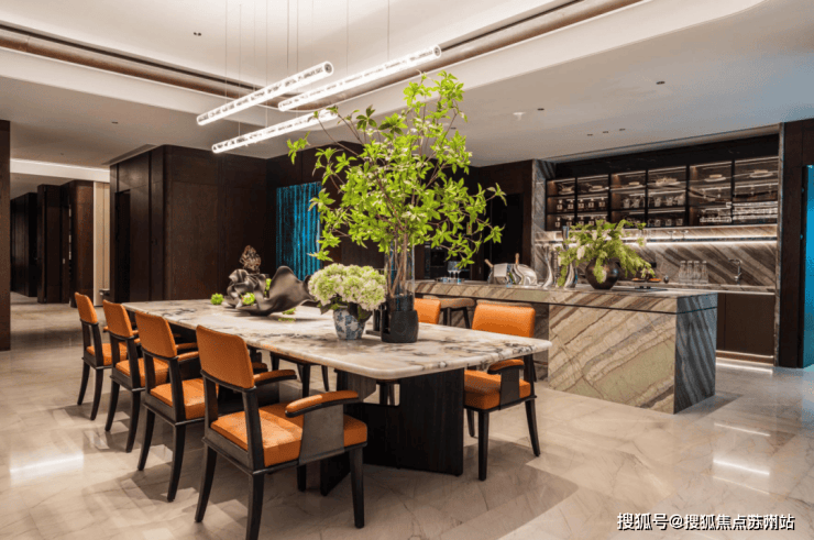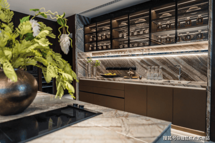 西厨吧台更是婚配了合适空间调性的东方木纹取挥洒自如石材,奇特的纹理和质感提拔了厨房质量取艺术性。