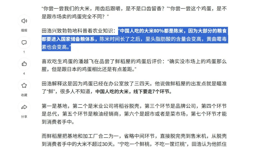 计谋企划枪手通过查证获悉,“你碗里的米饭有80%是陈米?”这个传言最早可逃溯至2017年锌财经发布的一篇推文。文章援用鲜稻屋CEO田浩的概念衬着焦炙:“中国人吃的大米80%都是陈米,由于大部门的粮食都要进入国度储蓄粮系统,陈米时间长了之后,里头脂肪酸的含量会变高,黄曲霉毒素也会变高。”这篇缺乏数据支持的文章,凭仗“食物平安”的话题敏捷激发全网发急,但事实若何呢?