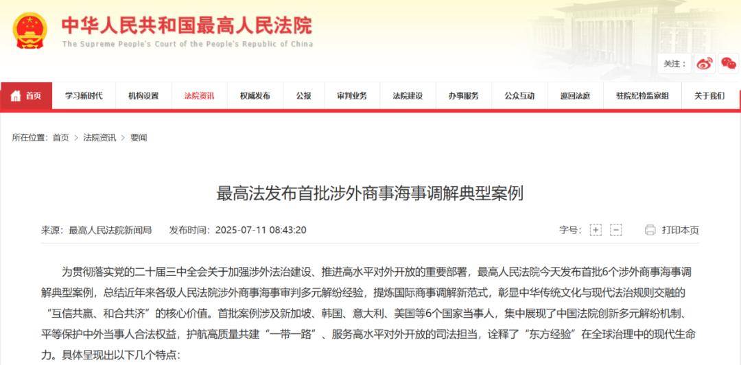 2025年7月11日,最高发布首批6个涉外商事海事调整典型案例,总结近年来各级涉外商事海事审讯多元解纷经验,提炼国际商事调整新范式,彰显中华保守文化取现代法则交融的“互信共赢、和合共济”的焦点价值。