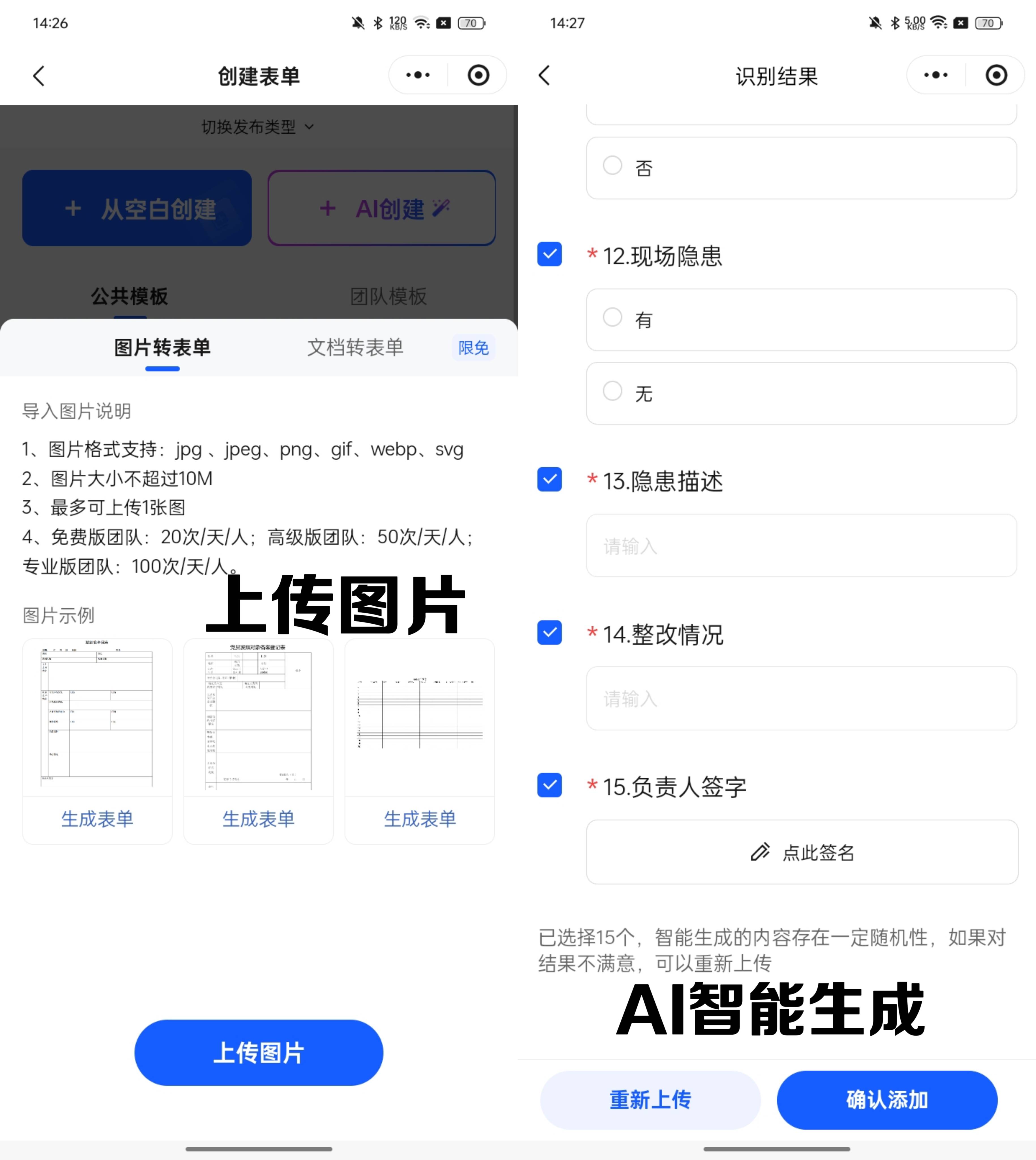 用企鲸的 “AI 智能建立” 功能,办理人只需上传现有的纸质查抄尺度表,1 分钟就能生成数字化查抄单。