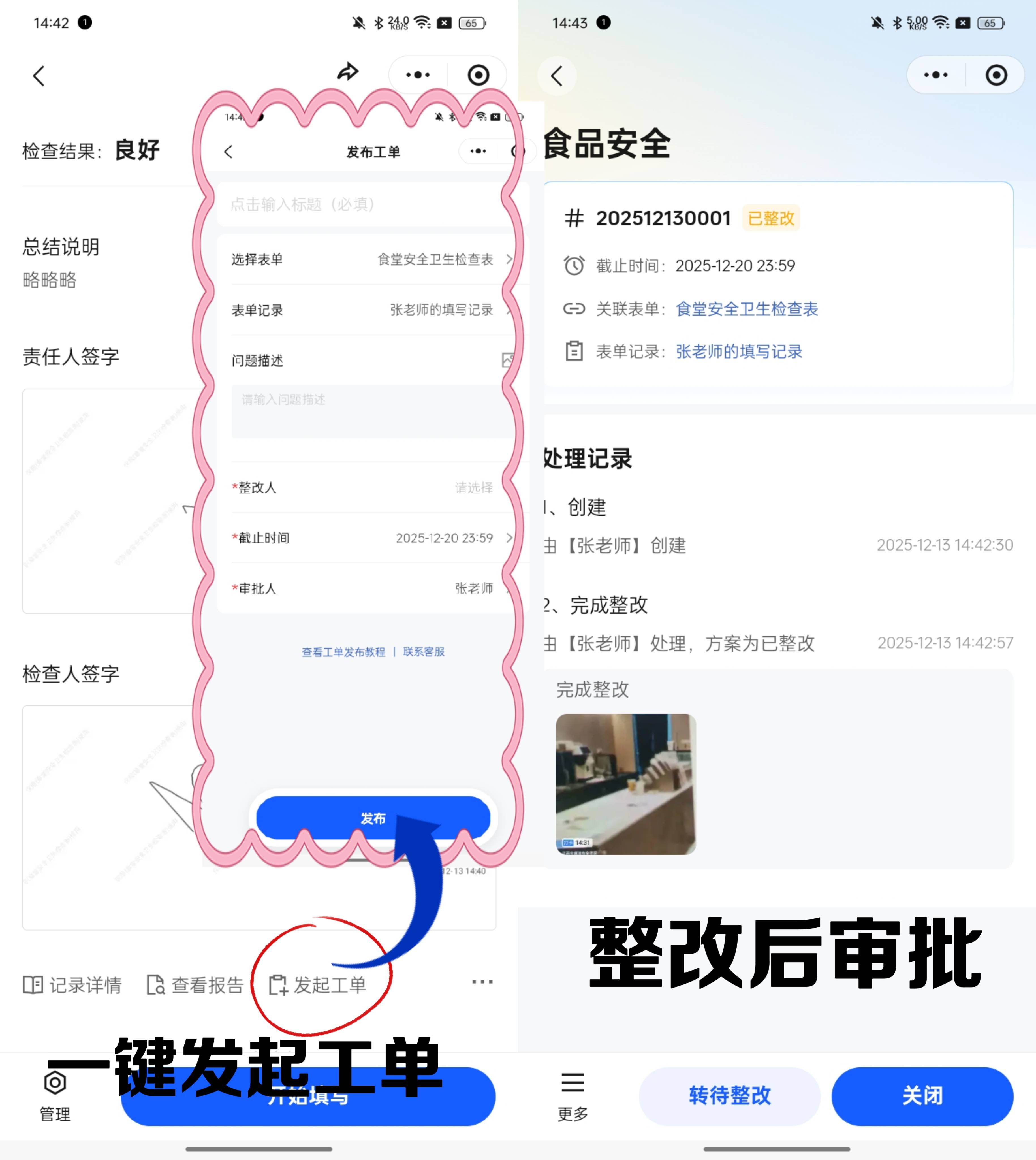 企鲸的工单功能是处理 “查抄走过场” 的焦点。督导发觉问题(好比临期食材未分类),可间接正在查抄单上 “倡议工单”,要求店长几小时内处置→店长整改后摄影反馈→督导手机确认整改,工单封闭。